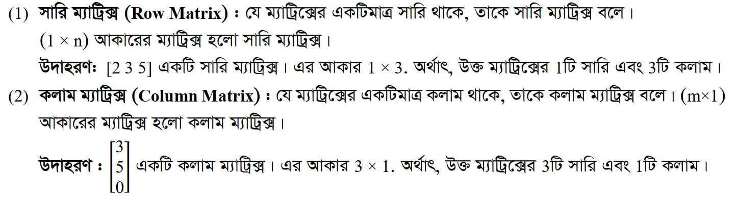 ১.২ ম্যাট্রিক্সের প্রকারভেদ (Classification of Matrices)