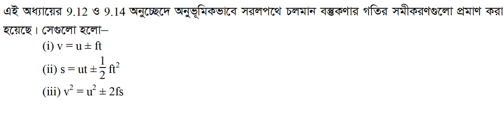 ৯.১৫ সমত্বরণে এবং u আদিবেগে কোনো চলমান বস্তুকণা t সময় পরে v বেগ প্রাপ্ত হলে অতিক্রান্ত দূরত্ব s = (u+v/2)*t